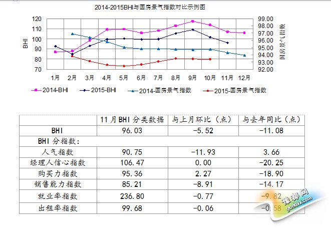 首先,分析本月全国房地产市场,据国家统计局数据显示,11月房地产开发景气指数(简称“国房景气指数”)为93.35,比上月提高0.01点。商品房销售面积商品房销售面积109253万平方米,同比增长7.4%,增速比1-10月份提高0.2个百分点。商品房销售额74522亿元,增长15.6%,增速提高0.7个百分点。11月,中央再提去库存,公积金新政落地,加上房企为冲刺年终业绩积极推盘,楼市成交继续上升,商品房销售市场稍有回暖。然而,全国房地产开发投资再创新低,前11个月全国房地产开发投资增速持续回落。2015年1-11月份,全国房地产开发投资87702亿元,同比名义增长1.3%,增速比1-10月份回落0.7个百分点。加上房地产市场对建材家居市场影响的滞后性,11月全国建材家居市场整体仍然低迷,BHI在冬日淡季出现季节性走低符合预期。