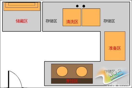 厨房布局最重要的是储藏、准备、清洗、存储和烹饪五大区域,合理的规划应该是从进门开始布局左往右依次是储藏区、清洗区、准备区、烹饪区,存储区穿插在清洗区、准备区和烹饪区之间,根据不同区域的操作需求存储相应的物件。