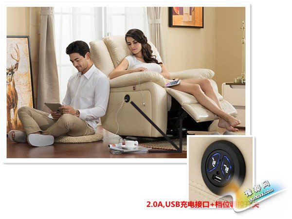 沙发一侧的调控开关上有一个2.0A极速充电接口,支持Android、iOS和Windows Phone三种系统。靠背可在105°-160°之间调节,想坐想躺一键控制,无论是在客厅、卧室还是书房,这款沙发都能让你的身心和娱乐设备能量满满。