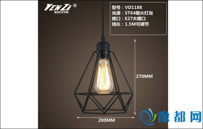 黑色的复古铁艺外观,这种铁艺灯线条简单,很好搭配。这款产品有很多种造型,相比于户主选的那款“鸟笼”造型的,小编更喜欢下图这种“钻石”造型的,显得更加有逼格,好啦,其实就是显得比较贵,女人嘛,总是无法抵抗钻石的魅力的,哪怕它只是一盏灯。