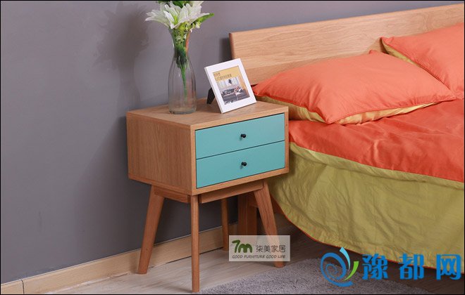 整体框架是橡木材质,加上MDF贴皮,外观大部分是原木色,抽屉部分却用了颜色来点缀,有浅蓝、黑色和白色三种,浅蓝偏小清新,放在北欧风的房间里可以起到点缀、装饰作用,这一点户主选择的非常好,如果换成白色可能就与整个房间融为一体,就像前面所说的变为简约风了,而黑色颜色太过沉重,也不太适合北欧风。