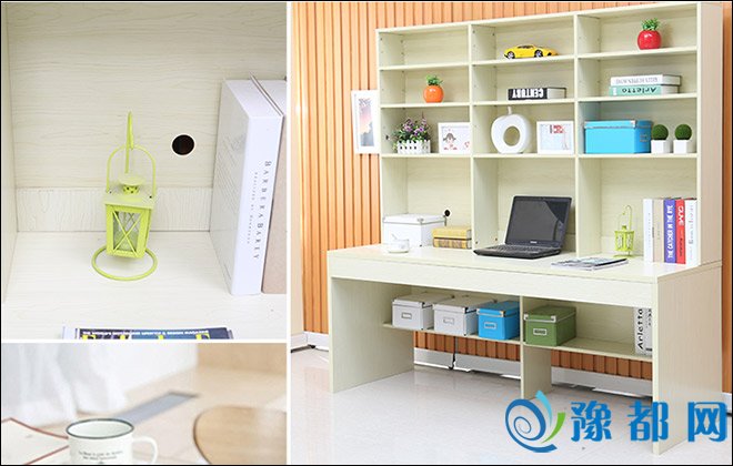 书柜上方毫无疑问放书、放装饰品都很方便,中间的电脑桌可以用来工作,电脑桌上方还特意留了个孔,可以容纳电脑线。下方也设置了几个搁板,可以放置东西,收纳性很强。