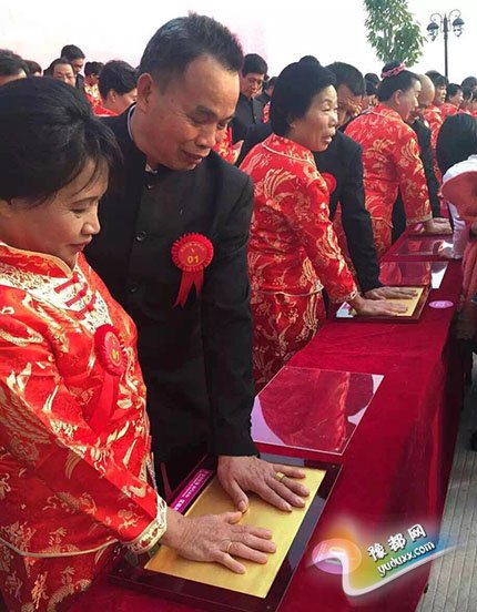 58对夫妇乘坐巡游花车前往古镇绿茵豪庭进行牵手同心印活动,每对夫妇手挽手在手模上按下了手印,每一个手模、手印都写有夫妇的名字,寓意永结同心。