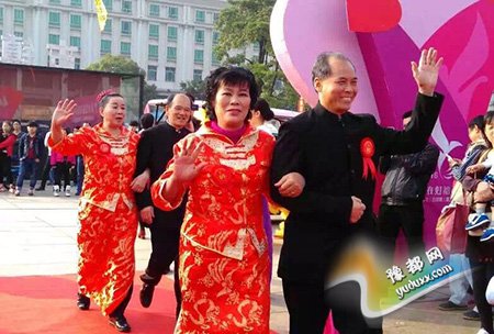 老夫老妻们在集体纪念婚礼酒会上走秀