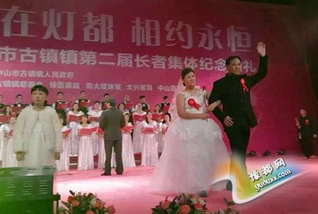 为营造温馨喜庆的婚礼氛围,主办方还举办了文艺晚会。古镇镇党委书记、人大主席刘建辉在晚会上向长者们祝酒,表达良好祝愿。晚会上,伴随着一段柔柔的萨克斯风音乐,屏幕上播起了《爱,相遇》视频,58对夫妇闻音出场,穿着白色婚纱的女士挽着男士的手,两老甜蜜地步入舞台,向众人挥手致意,迎来台下一片欢呼声。晚会主要是由本土节目的助庆演出,让老人家看得眉开眼笑;而记录古镇老年人晚年幸福生活的微电影,则展现了不同兴趣爱好老人的日常生活和精神面貌,里边的片段不乏深情的表白。