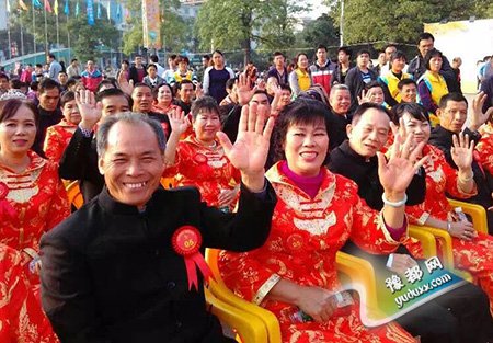 “平时工作忙碌,难以流连于亲友聚会,此次集体婚礼特意把在外地的亲戚朋友都请过来古镇参加婚礼晚宴,大家欢聚一堂,真的很开心。” 婚龄59年的谢海龙和熊三连夫妇激动地表示。