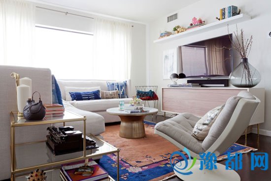 颜色丰富的地毯在白净的纯色空间中起到了聚焦视线的作用,同时也带来了舒适的居家触感。电视柜选择了造型简约的款式,电视墙上方以一块搁板来装饰,兼顾收纳的作用。