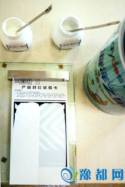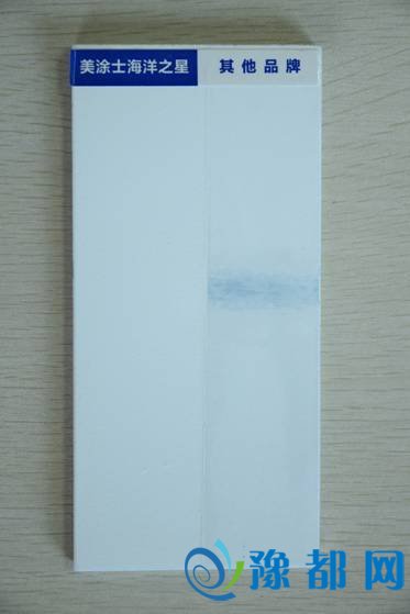 在遮盖力测试板左右分别勺上些许溶液,然后推平。测试板上,普通墙面漆一侧可以透出测试板原本的颜色。而美涂士海洋之星儿童房专用墙面漆一侧的深黑颜色完全不见了。