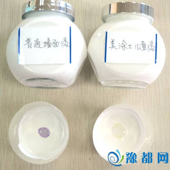 接下来,我们将对甲醛净化功能进行测试对比。首先,分别取出美涂士海洋之星儿童房专用墙面漆与市面上普通的儿童漆,分别滴入甲醛溶液,然后在滴入的甲醛溶液上滴一滴稳定剂,最后,利用甲醛显色反应原理将显色剂滴在其中。