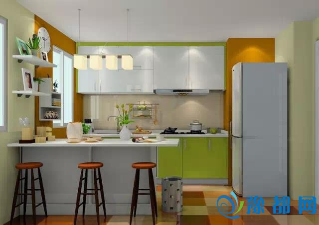 根据户型设计橱柜,合理利用空间。明亮的橙色与黄绿色两大色块相搭配,加上实用餐桌。让整个空间充满生活气息。