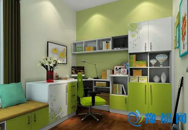 书房主要以绿色为主色调,同时设计了吊柜、立柜、书桌等家具,进一步的增加书房的收纳空间,让您众多书籍都有位置摆放,柜体错落有致的搭配也能增加储物功能,是集休闲与办公于一体的书房。