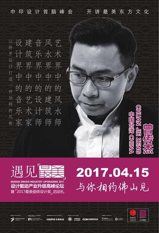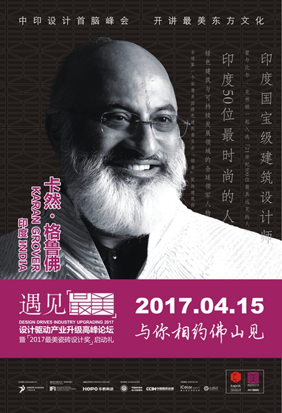 顺应回归东方文化之势的风潮,本次论坛力邀世界第一个荣膺美国绿色建筑委员会(USGBC)“铂金”奖、曾与比尔·克林顿一起入选“21世纪500位最具远见的人”的印度国宝级建筑设计师卡然·格鲁弗先生(KARAN GROVER),和来自中国台湾的痴迷音乐、擅长绘画、深谙风水、以“懂风水的室内设计师”自居的曾传杰先生,联袂出席作为本次论坛的主旨嘉宾;中印设计首脑风云对话、新译大美东方,势必给来自全国的设计圈和陶瓷圈的精英人士带来一场关于【设计+文化】【设计+产业】【设计+未来】的饕鬄盛宴!