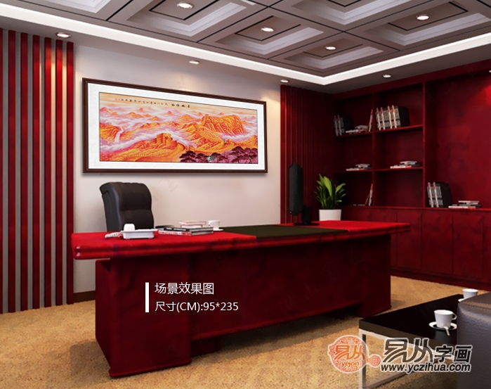 【深度剖析长城山水画的背后含义】:万里长城是世界上独一无二的建筑,只有中国才有,是中华民族和国家的象征。我们坐在座位上时,长城画正在两肩之上,水平位置高于座位。取象中华巨龙,风水暗示:有靠山,有龙脉绵延千里,这幅长城画云雾缭绕、藏风聚气,象征我们未来的事业将风生水起必将实现中华民族的伟大复兴。办公室要的就是这气势。