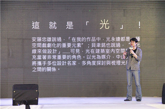 邵唯宴:今天很开心来到中山,中山在台湾还蛮有名的,因为台湾很多灯饰都是从中山进口的,中山对我来讲就是一个光的城市。光的主题很广泛,大家都在谈光,而光在实物以外有什么可能的想象呢? 首先我想从意大利开始讲对光和空间的想象。2007年意大利威尼斯第11届建筑双年展邀请了11个前辈带10个年轻人到意大利做展览。当时台湾选出了十个年轻人,当时我被选中作为团队一员参加这个盛会。我们做这个事情想到了次世代,而我们代表这个时代产生了什么力量阐述我们的价值? 2007年回来之后,2008年日本安藤忠雄也注意到这个事件,所以邀请了10个亚洲国家的年轻人去做对话和交流,当时在大阪举办了一个平台“年轻建筑交流会议”。当时候我也我开始犹豫,我到底要做什么?回到刚才,安藤先生就送了我一句话“边走边思考”。